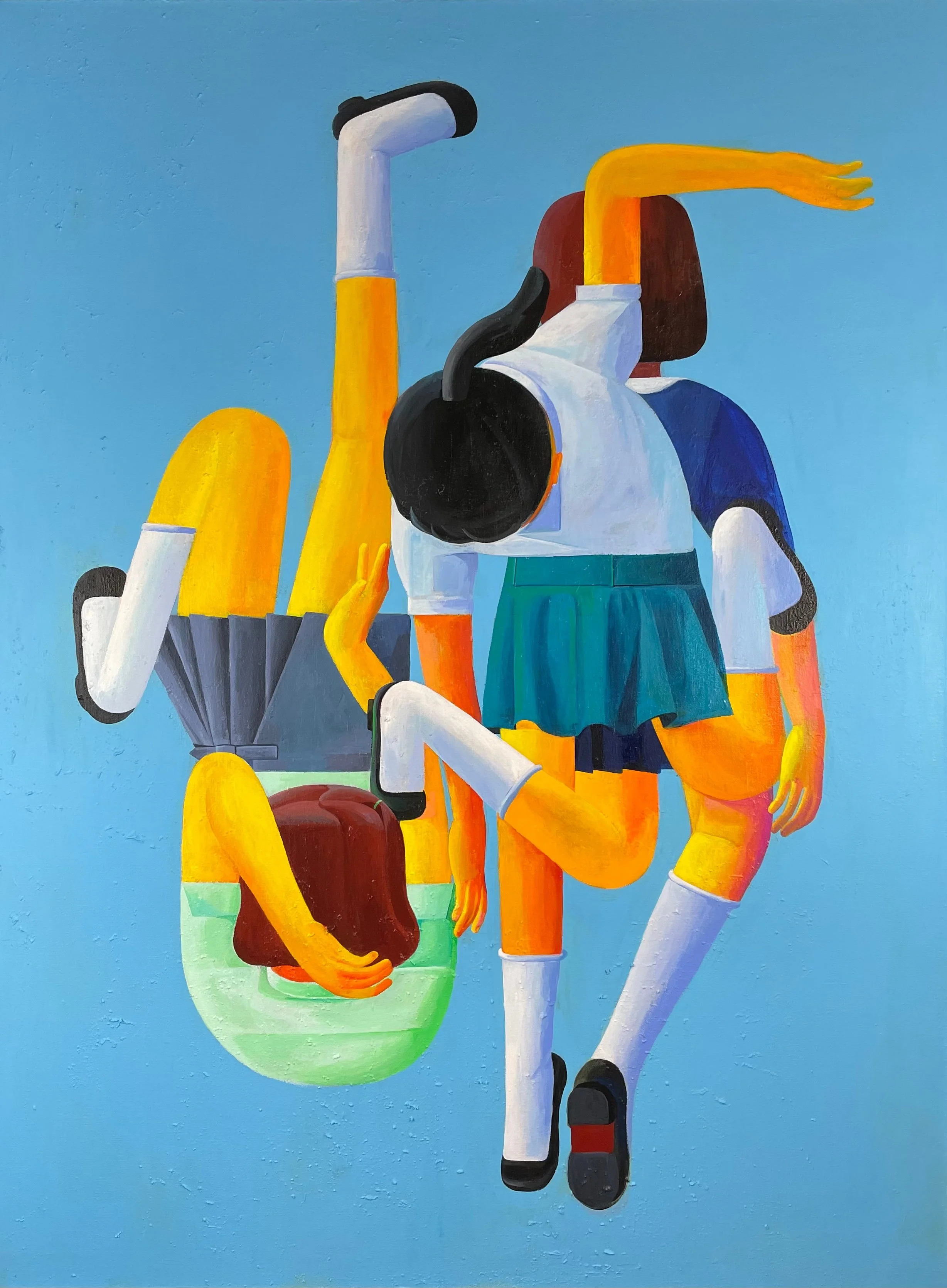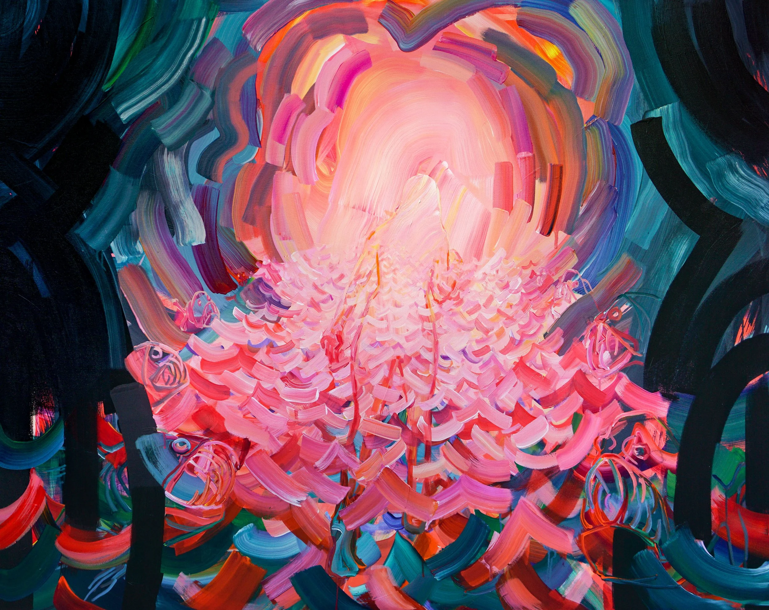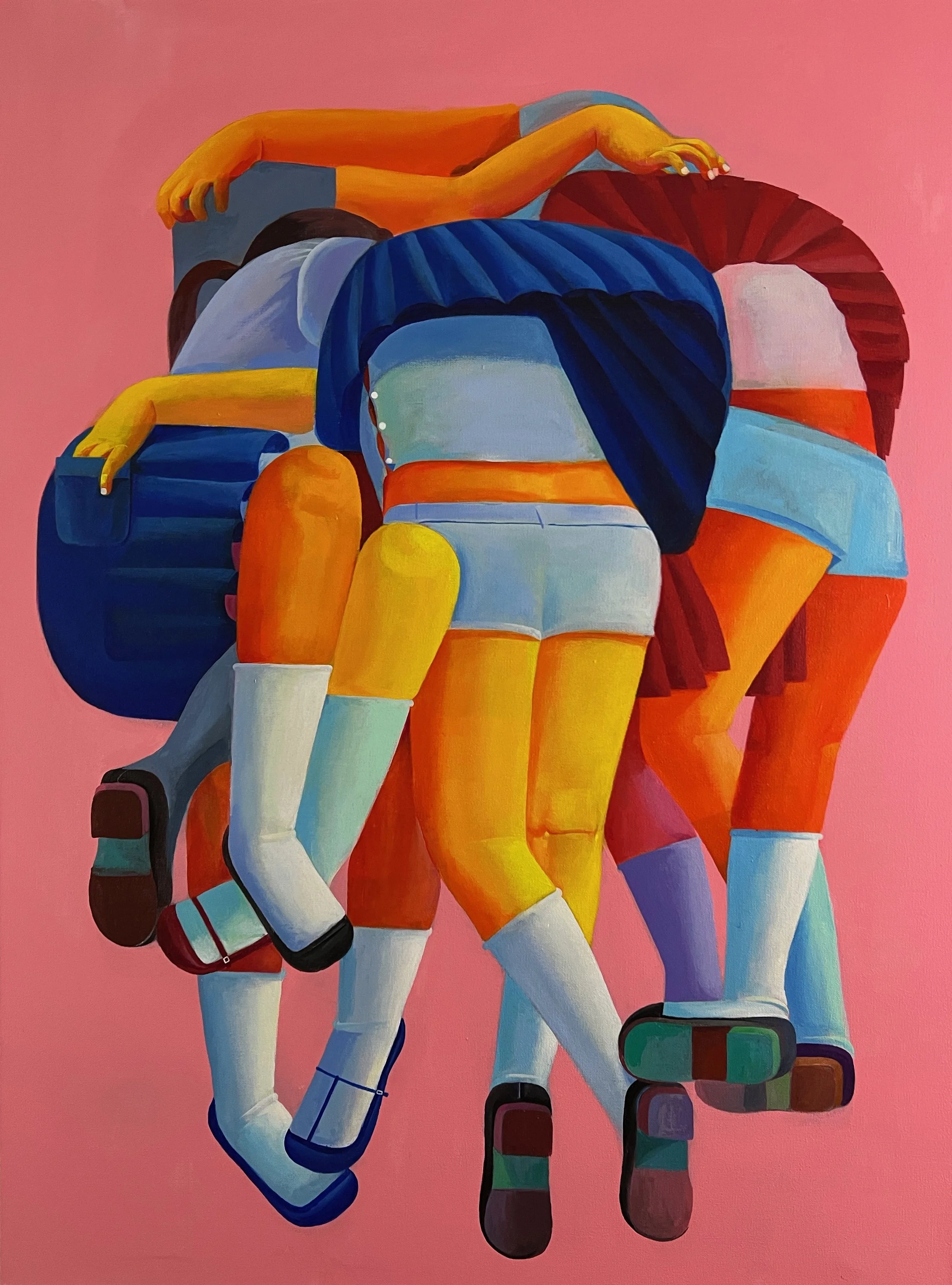 The six artists in this show approach color from distinctly unique positions. Ziui Chen uses color to meld Euro-American and Chinese painting traditions, re-coloring her childhood with fantastical vignettes of intimacy and affection. Krista Dedrick-Lai uses vibrant and contrasting hues to paint the emotional intensities of motherhood. Sean Gerstley’s ceramic works explore the whimsy and joy of adding color in unexpected places around the home. Su Knoll Horty’s Color Pops utilize what she calls “analogous tones” to create cosmic, environmental works. Eric Uhlir’s energetic style and dense scenes rely on color’s full spectrum to deliver dynamic and immersive compositions. Maria Zamora’s textiles and painting masterfully utilize fundamental color schemes to maximum effect, relishing in the richness of colors both natural and unnatural.