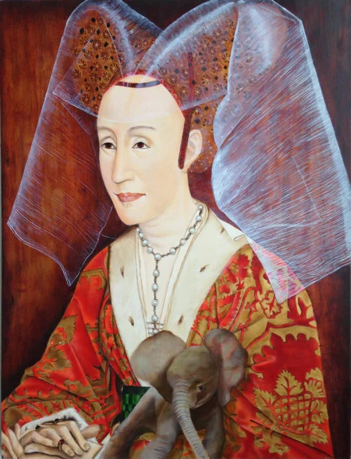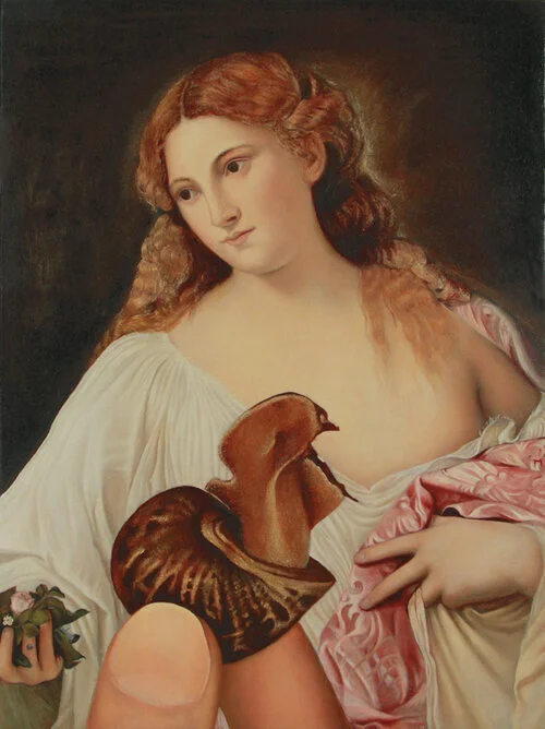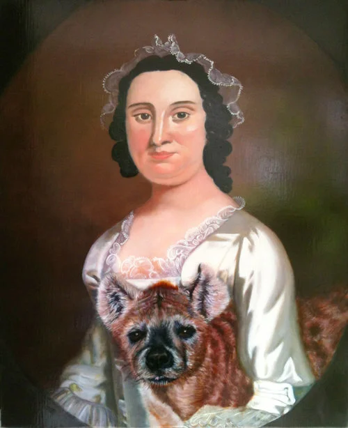 "Pirate-Eyed, Horned-Owled Elizabeth Vigee Le Brun, Portaitist for Marie Antionette, Portraying Herself, Inspired by Rubens, as Recily Open-Mouthed, Imbued with the Power of her Prey, Bluejay and Hare, Whom she/Owl has Consumed so she May Rise in the Night Sky for a Magical Flight and Better View of Future Prey"